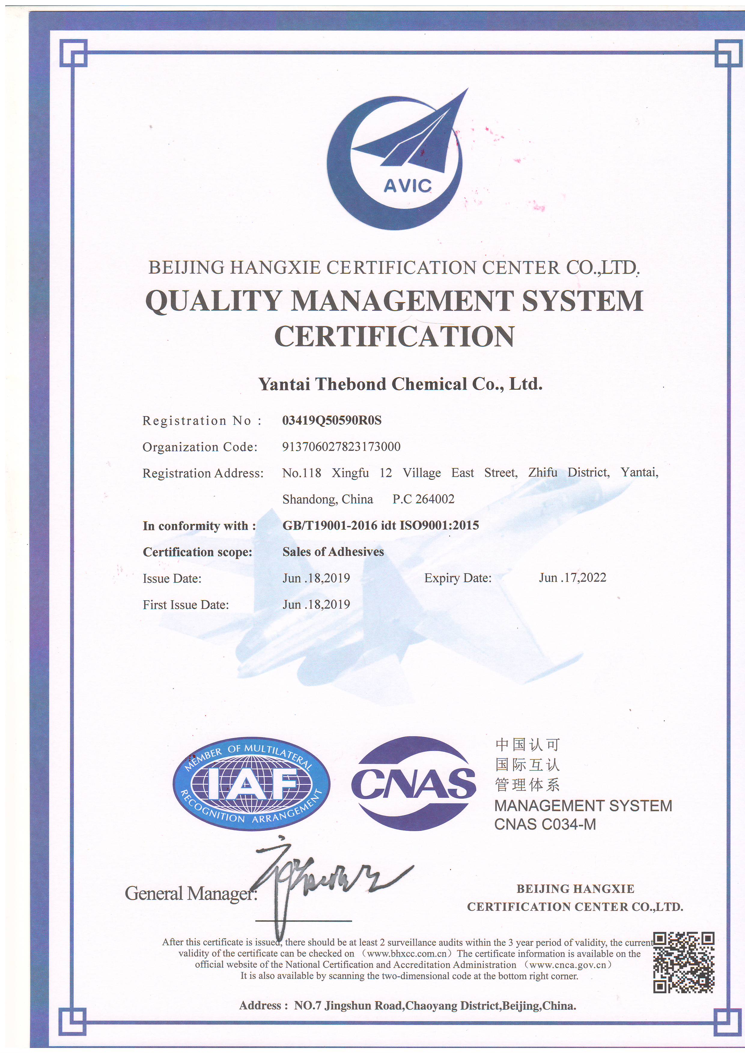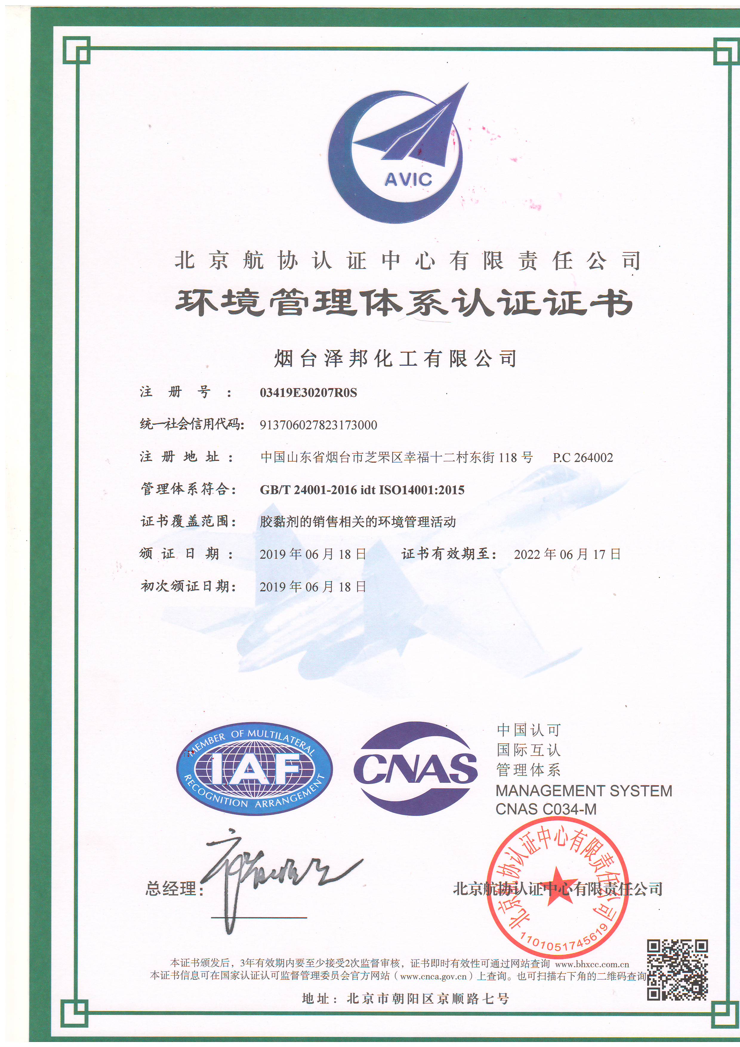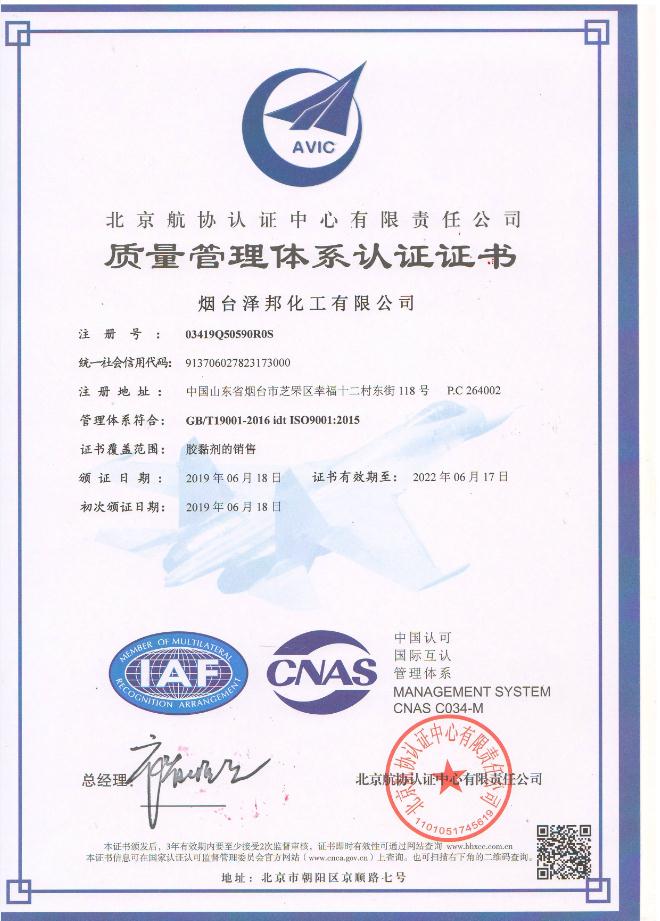 煙臺(tái)澤邦化工有限公司于2019年6月18日順利通過ISO9001:2016質(zhì)量管理體系認(rèn)證。認(rèn)證信息可在國家認(rèn)證認(rèn)可監(jiān)督管理委員會(huì)網(wǎng)站(www.cnca.gov.cn)上查詢。